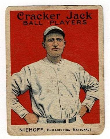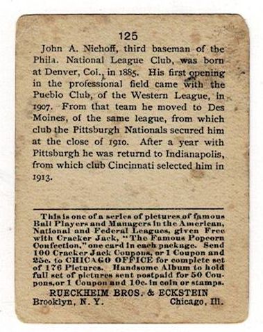 1915 Cracker Jack Bert Niehoff #125 Philadelphia. This card is in very good condition with corner wear and a small corner crease.