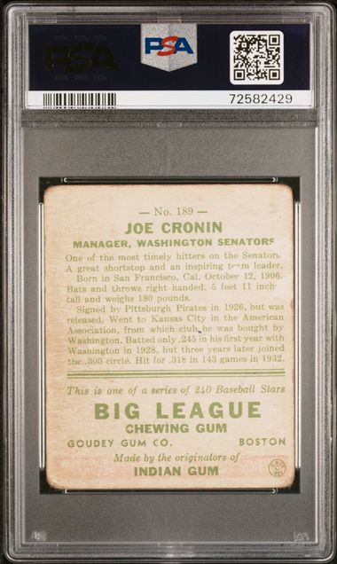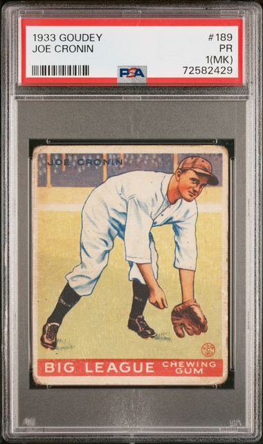 1933 Goudey Joe Cronin PSA 1 (MK). There is faint writing on the back.