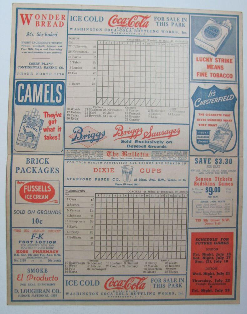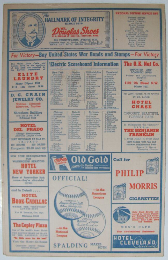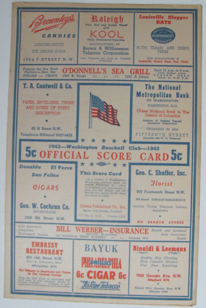 1943 Washington Senators vs. Boston Red Sox Scorecard. This scorecard is in excellent condition.