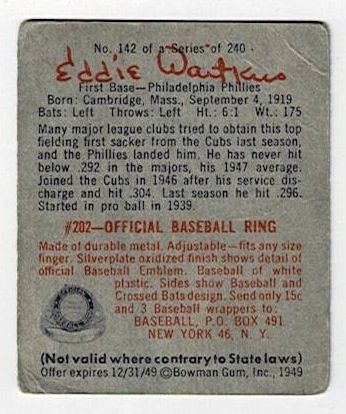 1949 Bowman Baseball Eddie Waitkus #142. This card is in very good condition with corner wear and a surface wrinkle.
