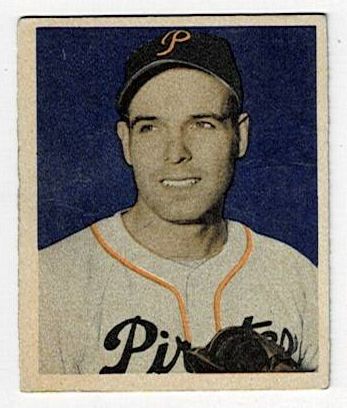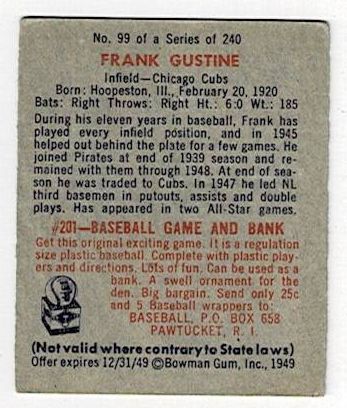 1949 Bowman Baseball Frank Gustine #99. This card is in very good condition with corner wear and a crease.
