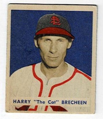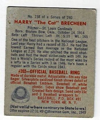 1949 Bowman Baseball Harry Brecheen #158. This card is in very good condition with corner wear and a surface wrinkle.