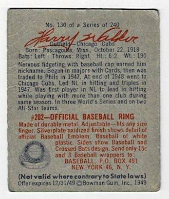 1949 Bowman Baseball Harry Walker #130. This card is in very good condition with corner wear and a small corner crease.