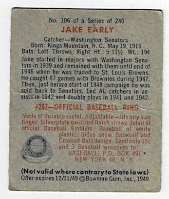1949 Bowman Baseball Jake Early #106. This card is in very good condition with corner wear and a crease.
