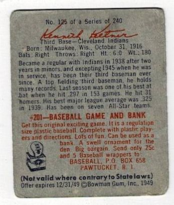 1949 Bowman Baseball Ken Keltner #125. This card is in very good condition with corner wear and a small corner crease.