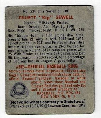 1949 Bowman Baseball Rip Sewell #234. This card is in very good condition with corner wear and a small corner crease.