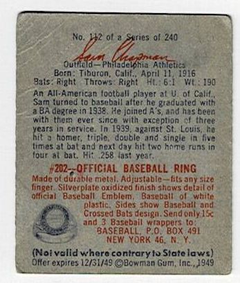 1949 Bowman Baseball Sam Chapman #112. This card is in very good condition with corner wear and a small corner crease.