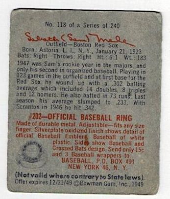 1949 Bowman Baseball Sam Mele #118. This card is in very good condition with corner wear and no creases.