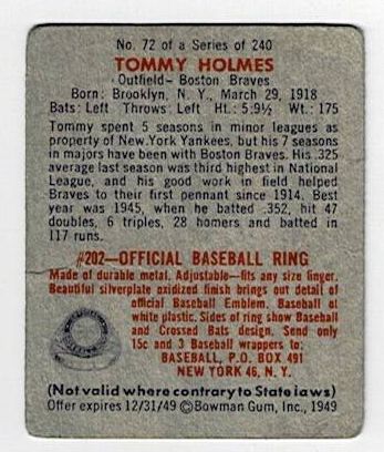 1949 Bowman Baseball Tommy Holmes #72. This card is in very good condition with corner wear and a crease.
