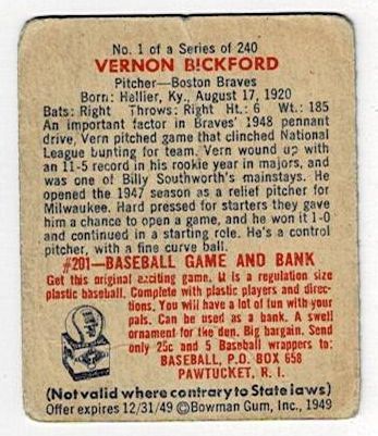 1949 Bowman Baseball Vern Bickford #1. This card is in good condition with corner wear and creases.