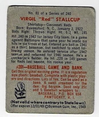 1949 Bowman Baseball Virgil Stallcup #81. This card is in very good condition with corner wear and a crease.