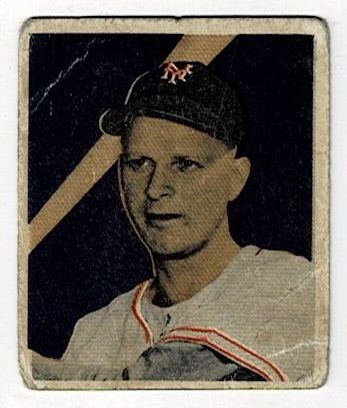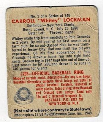 1949 Bowman Baseball Whitey Lockman #2. This card is in good condition with corner wear and creases.