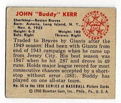 1950 Bowman Baseball Buddy Kerr #55. This card is in very good condition with corner wear and a small corner crease.