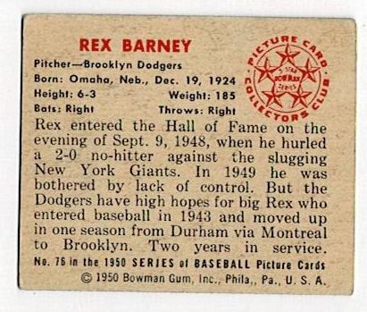1950 Bowman Baseball Rex Barney #76. This card is in very good condition with corner wear and no creases.
