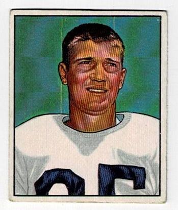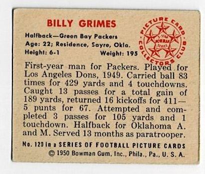 1950 Bowman Football Billy Grimes #120. This card is in very good condition with corner wear and no creases.