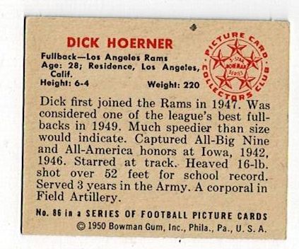 1950 Bowman Football Dick Hoerner #86. This card is in excellent condition with minor corner wear and no creases.