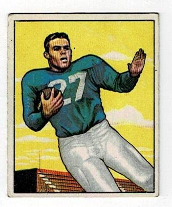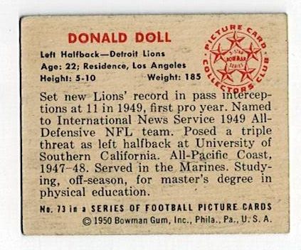 1950 Bowman Football Donald Doll #73. This card is in very good condition with corner wear and a surface wrinkle.