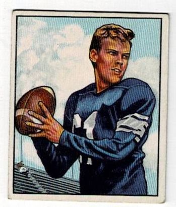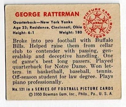 1950 Bowman Football George Ratterman #121. This card is in excellent condition with minor corner wear and no creases.