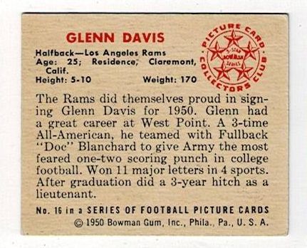 1950 Bowman Football Glenn Davis #16. This card is in excellent condition with minor corner wear and no creases.
