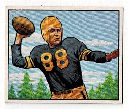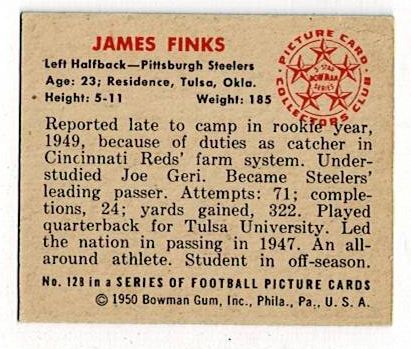 1950 Bowman Football Jim Finks #128 HOF. This card is in very good condition with corner wear and a small corner crease.