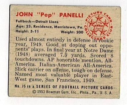 1950 Bowman Football John Panelli #75. This card is in very good condition with corner wear and no creases.