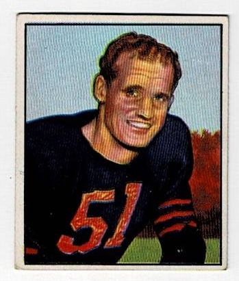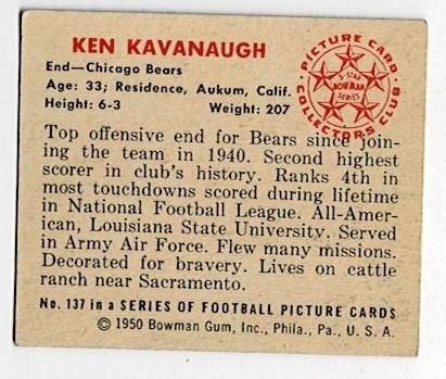 1950 Bowman Football Ken Kavanaugh #137. This card is in very good condition with corner wear and a surface wrinkle.