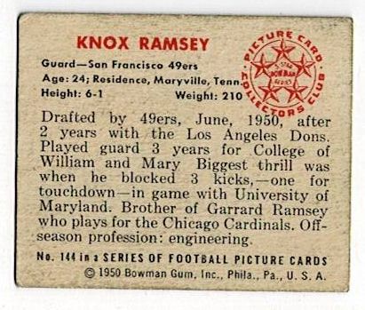1950 Bowman Football Knox Ramsey #144. This card is in very good condition with corner wear and no creases.