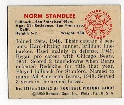 1950 Bowman Football Norm Standlee #143. This card is in very good condition with corner wear and no creases.