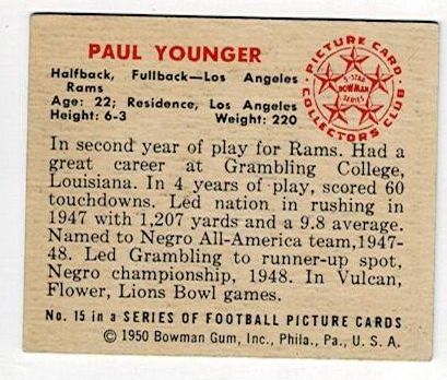 1950 Bowman Football Paul Younger #15. This card is in very good condition with corner wear and no creases.
