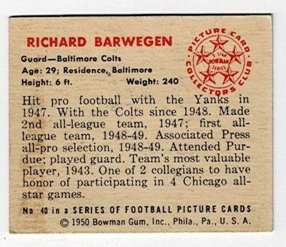 1950 Bowman Football Richard Barwegen #40. This card is in very good condition with corner wear and a surface wrinkle.