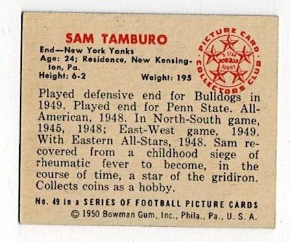 1950 Bowman Football Sam Tamburo #49. This card is in excellent condition with minor corner wear and no creases.