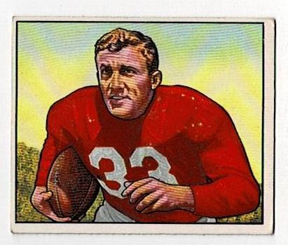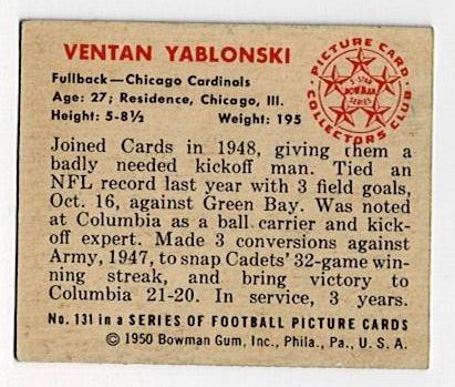 1950 Bowman Football Ventan Yablonski #131. This card is in excellent condition with minor corner wear and no creases.
