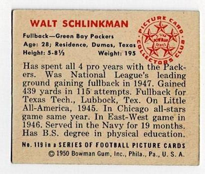 1950 Bowman Football Walt Schlinkman #119. This card is in very good condition with corner wear and no creases.