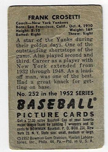 1952 Bowman Frank Crosetti #252. The card is in good condition with corner wear and a crease.
