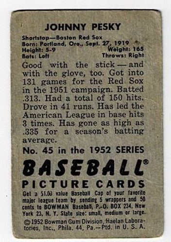 1952 Bowman Johnny Pesky #45. The card is in good condition with corner wear and a crease.