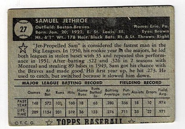 1952 Topps Baseball #27 Sam Jethroe Black Back