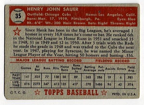 1952 Topps Hank Sauer #35 Red Back GOOD-VG