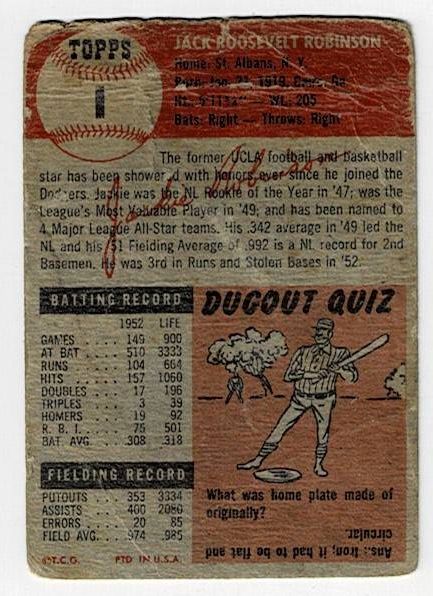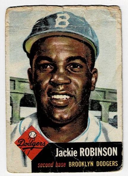 1953 Topps Jackie Robinson #1. The card is in fair-good condition with top corner wear and creases.