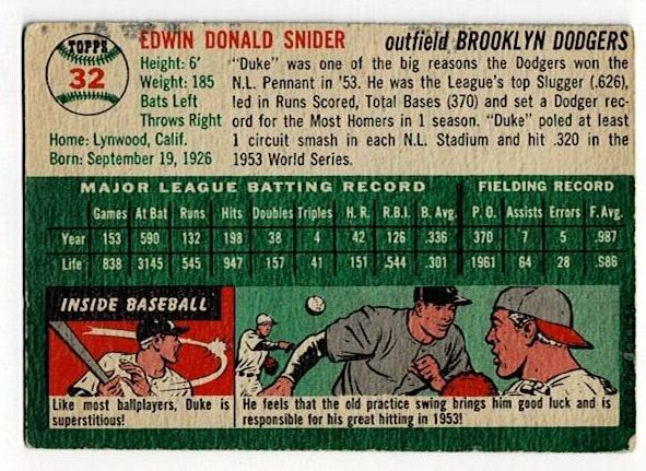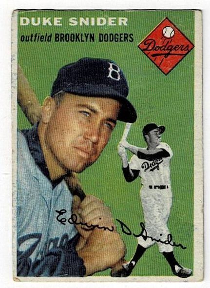 1954 Topps Duke Snider. The card is in very good condition with corner wear and a surface wrinkle.
