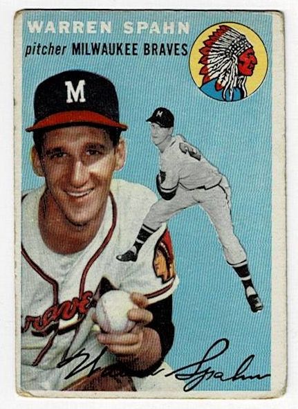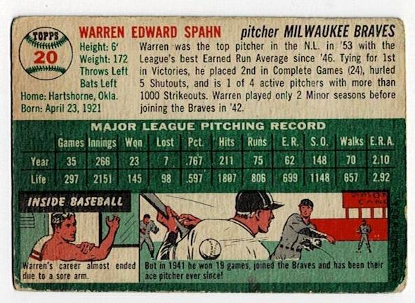 1954 Topps Warren Spahn #20. The card is in very good condition with corner wear.