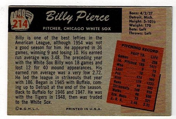 1955 Bowman Baseball Billy Pierce #214. This card is in very good condition with corner wear and a small corner crease.