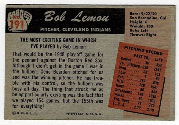 1955 Bowman Baseball Bob Lemon #191. This card is in very good condition with corner wear and no creases.