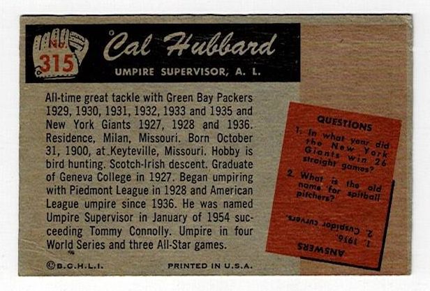 1955 Bowman Baseball Cal Hubbard #315. This card is in very good condition with corner wear and a crease.
