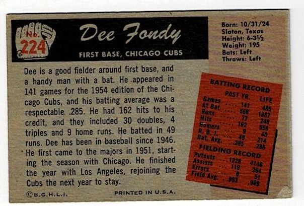 1955 Bowman Baseball Dee Fondy #224. This card is in excellent condition with minor corner wear and no creases.