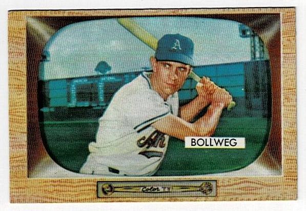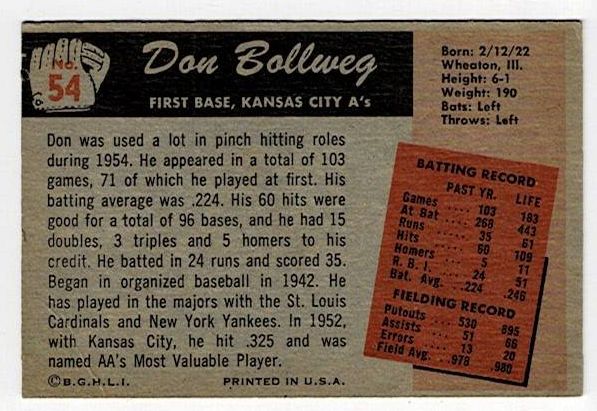 1955 Bowman Baseball Don Bollweg #54. This card is in very good condition with corner wear and no creases.