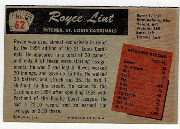 1955 Bowman Baseball Royce Lint #62. This card is in very good condition with corner wear and a crease.