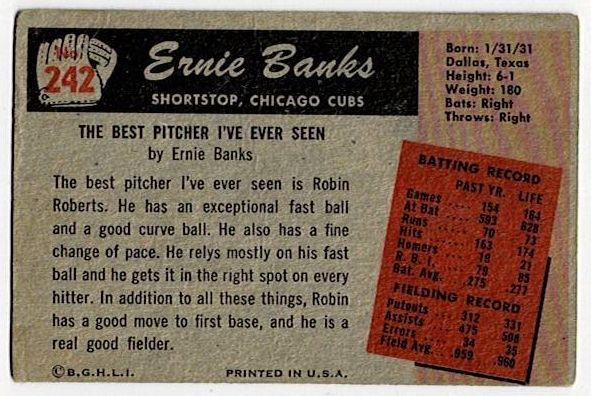 1955 Bowman Ernie Banks #242. The card is in very good condition with corner wear and a surface wrinkle.