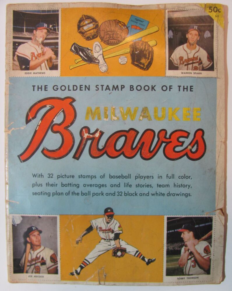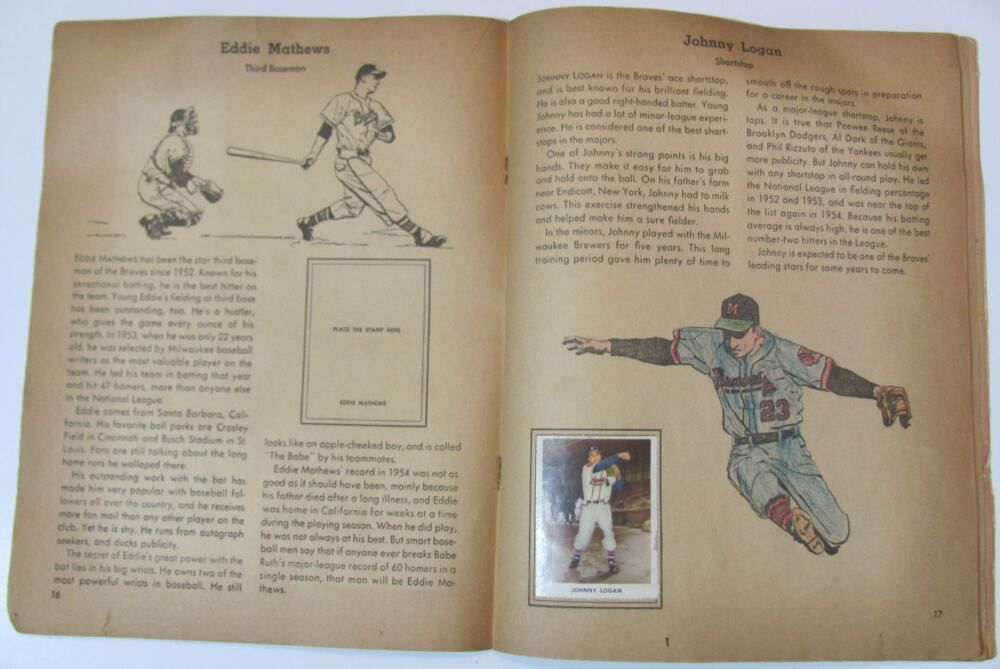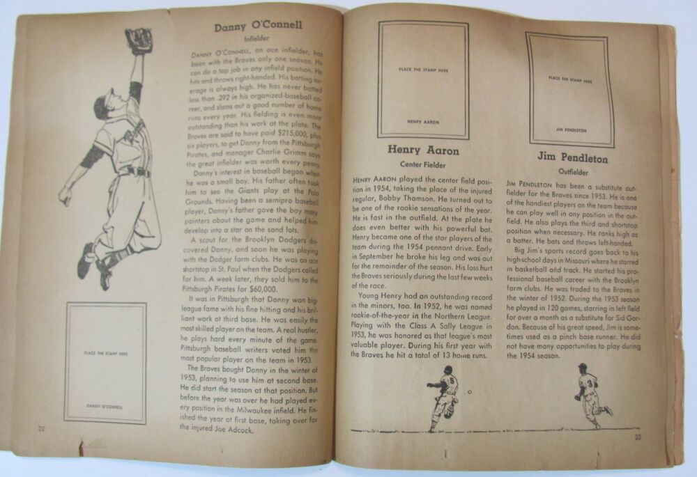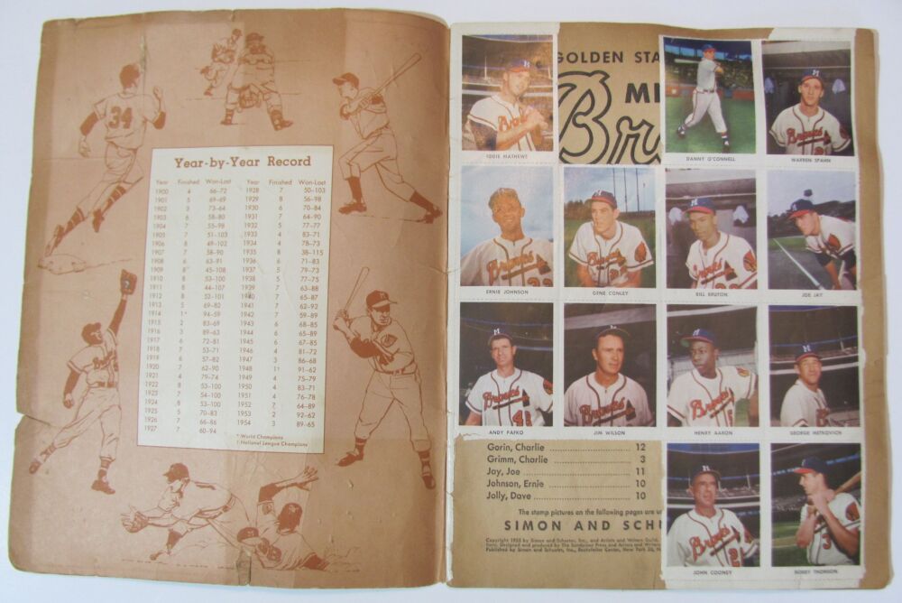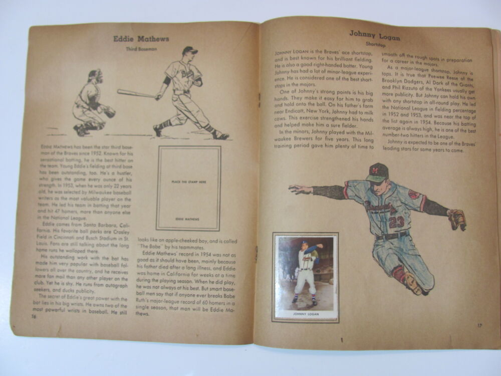 This book is in good condition. The stamps are pasted together rather than on their player pages. All of the HOFers are present and might be steamed off if desired.
