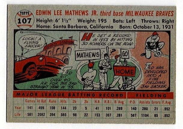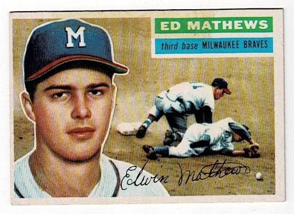 1956 Topps Eddie Mathews #107. This card is in excellent condition with minor corner wear and no creases.
