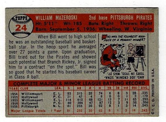 / 1957 Topps Bill Mazeroski #24 Rookie